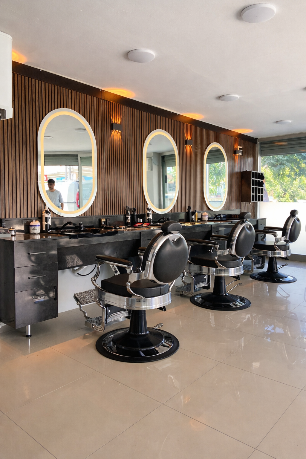 Profesyonel kullanıma uygun olarak tasarlanan bu berber tezgâhı, hem yeni açılan hem de yenilenen salonlar için fonksiyonel ve şık bir çözümdür.