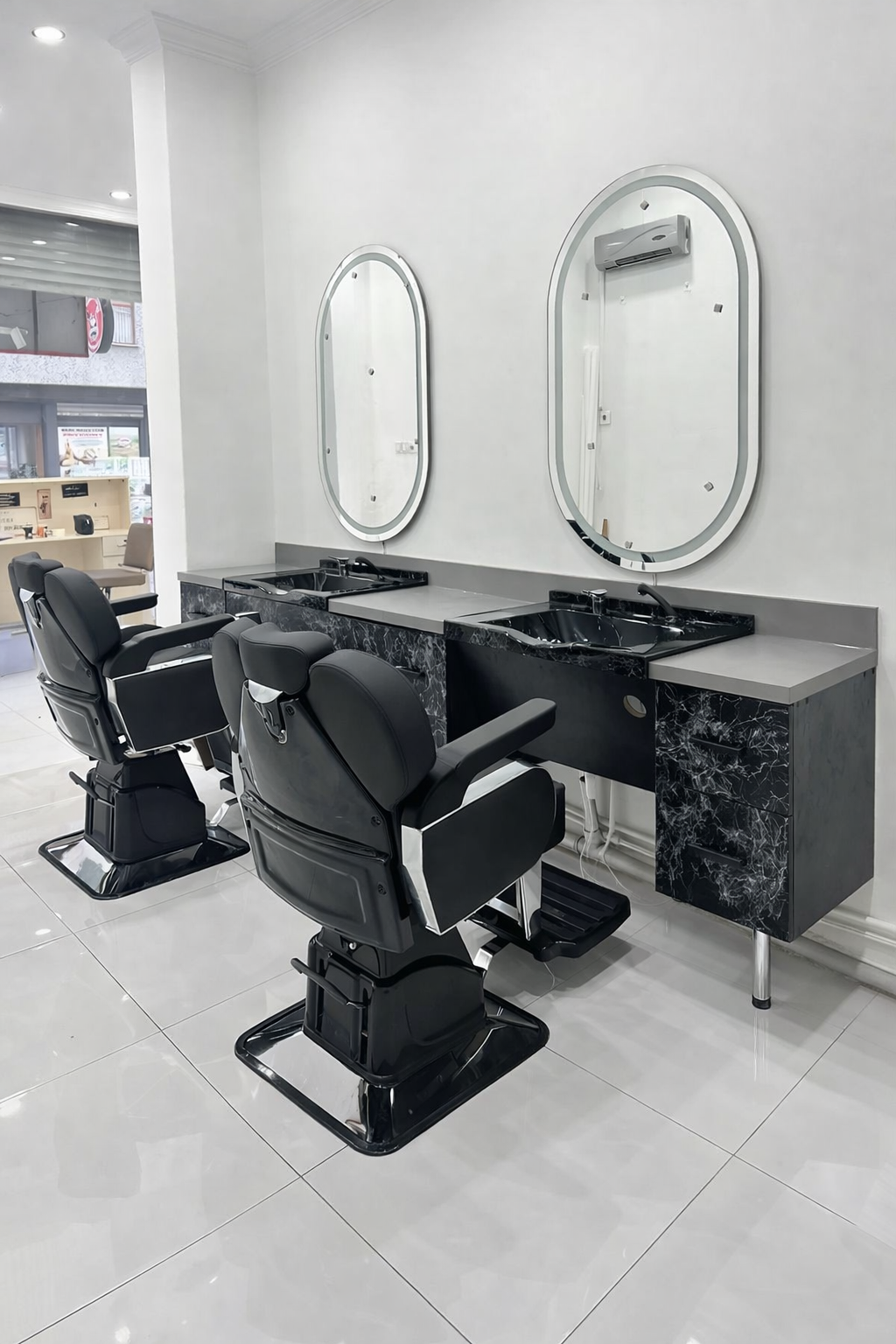 Profesyonel kullanıma uygun olarak tasarlanan bu berber tezgâhı, hem yeni açılan hem de yenilenen salonlar için fonksiyonel ve şık bir çözümdür.